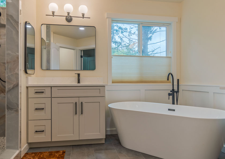 A stunning bathroom remodel that redefined elegance and functionality. The project began with the removal of a double-sided fireplace and an outdated tub deck to make way for a sleek, free-standing tub that became the room's centerpiece. We installed new tile flooring throughout, along with beautifully designed shower floors and walls, creating a seamless and luxurious aesthetic. A new shower window was added to invite natural light, enhancing the space's warmth and openness. The transformation was completed with a custom vanity, upgraded countertops, stylish mirrors, and modern lighting fixtures, delivering a sophisticated and refreshing retreat for our client.